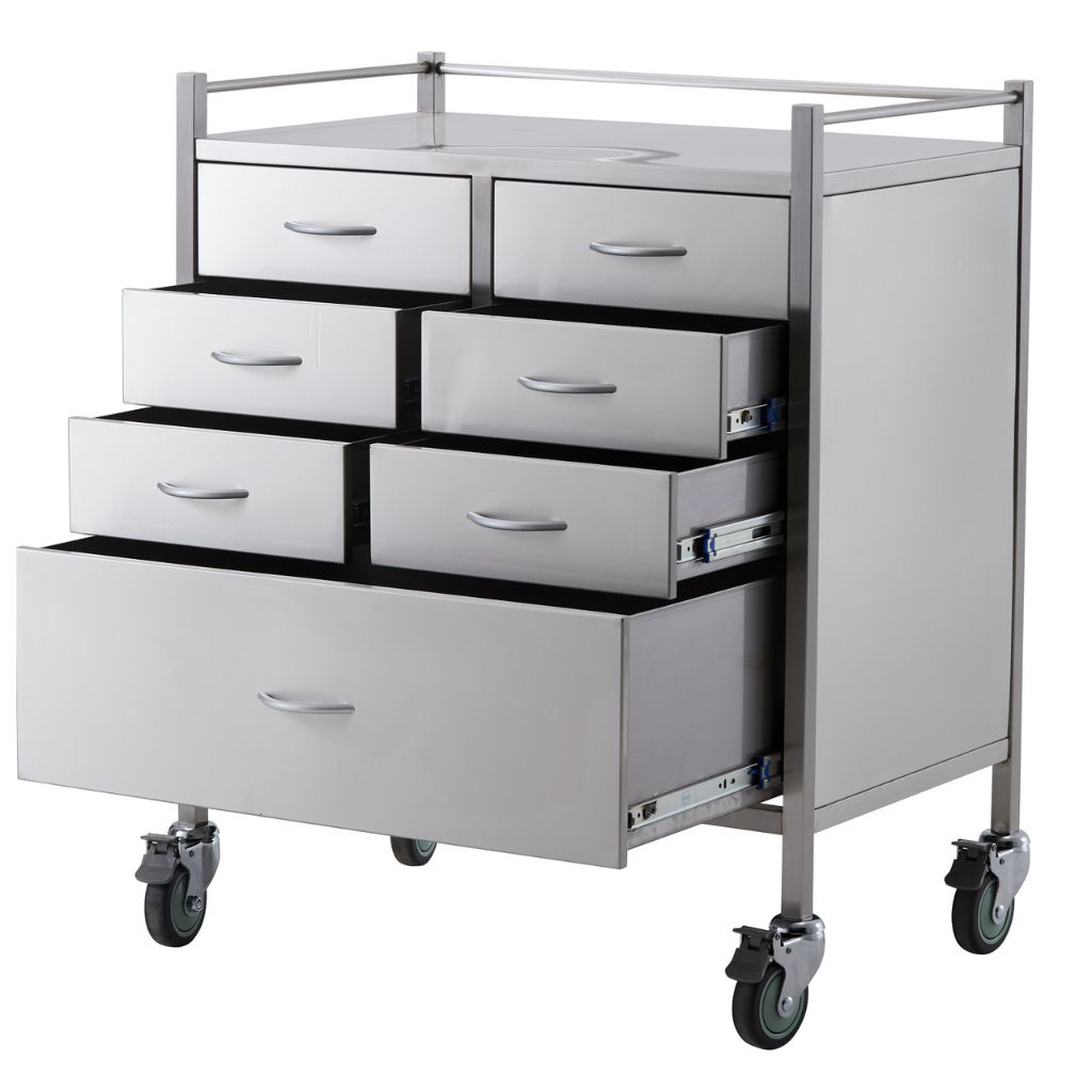 A strong high quality seven drawer resuscitation trolley with rails on top and lockable castors for safety.