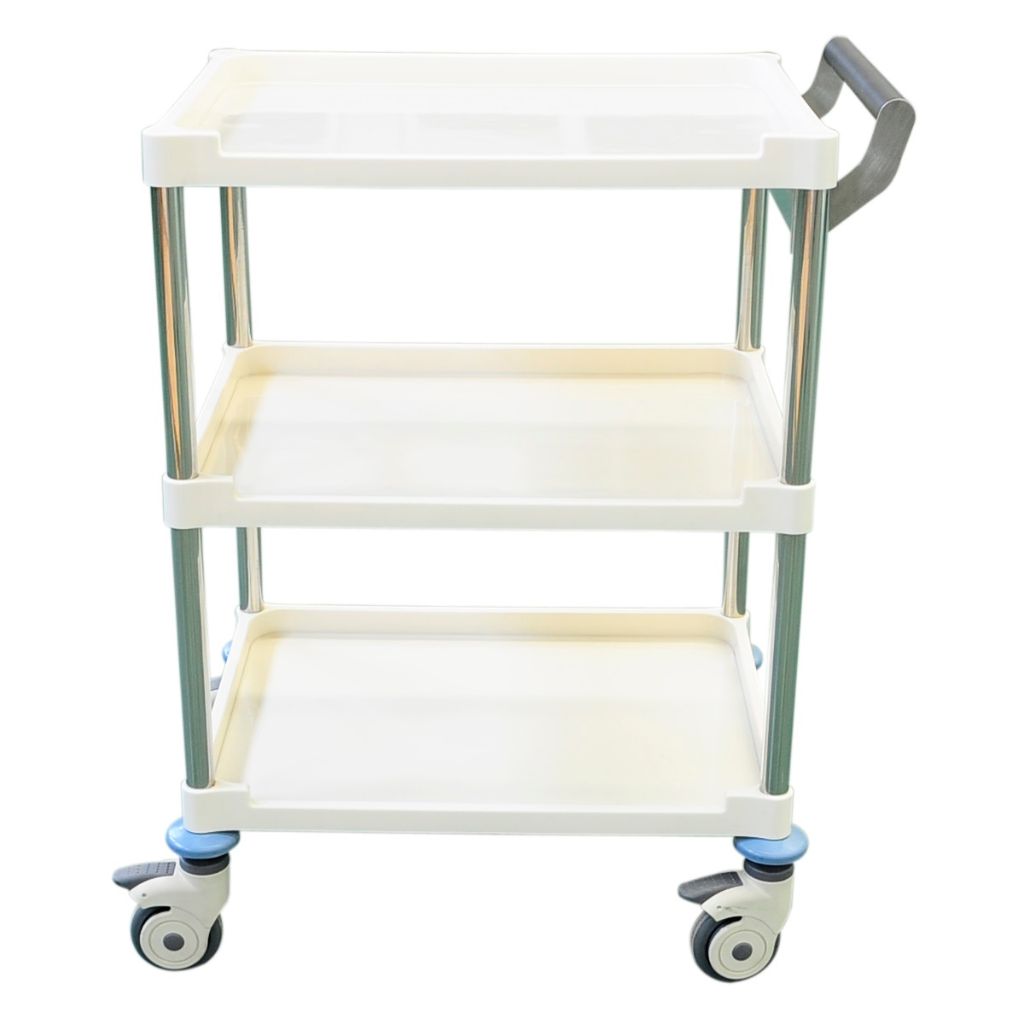 A strong ABS instrument trolley with one shelf for transport of goods throughout healthcare facilities.