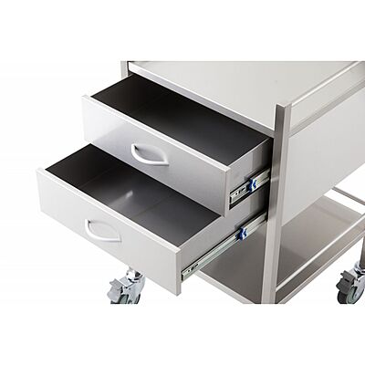 A high grade two drawer stainless steel trolley with smooth rolling castors, shelf, rails and an outstanding finish.