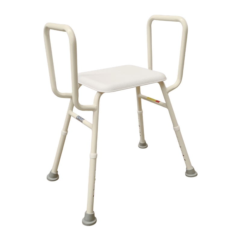Heavy duty height adjustable shower stool with arm support and wide seating space. Designed to be placed in the shower to provide seated safety while showering; its compact size makes it ideal for small shower spaces.