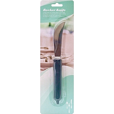 The Rocker Knife has a curved blade and uses a rocking motion to slice food instead of a sawing motion of regular knives