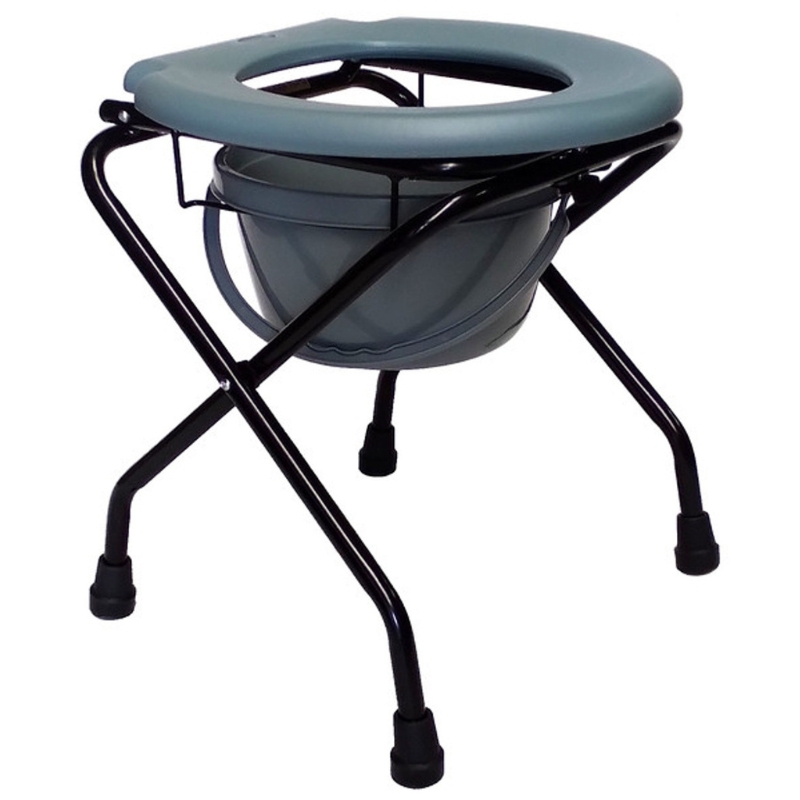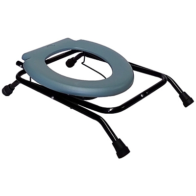 Stand alone commode stool designed to easily fold for portability and storage. Great for travelling and camping