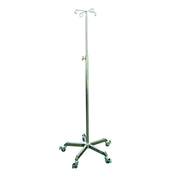 A strong four hook stainless steel IV stand with a five leg weighted base and easy mobility.