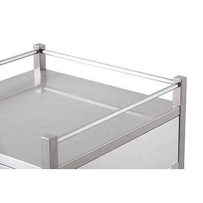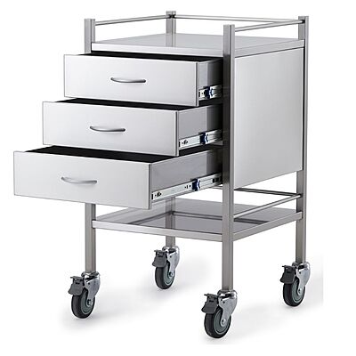 A high grade three drawer stainless steel trolley with smooth rolling castors, shelf, rails and an outstanding finish.