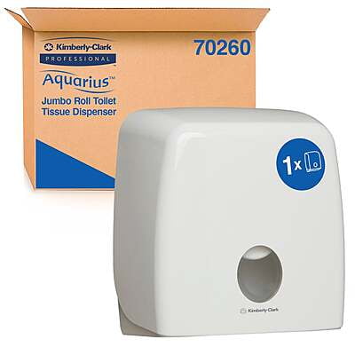 The Kimberly-Clark Professional Aquarius Jumbo Roll Dispenser offers a practical and convenient solution for washrooms. Holding one jumbo roll at a time, this commercial toilet paper dispenser provides high volume rolled toilet tissue for busy washroom spaces. This toilet tissue dispenser is a quick-fill system, suitable for selected Kleenex and Scott Jumbo Sized Toilet rolls. It has a viewing window so you can see when a refill is needed. The Aquarius Jumbo Roll Dispenser is sleek and contemporary in design, with a white, high-gloss, easy-clean finish. The Kimberly-Clark Professional Aquarius Jumbo Roll Dispenser forms part of a wider range of washroom products designed to create a safer, healthier and more productive workplace.
