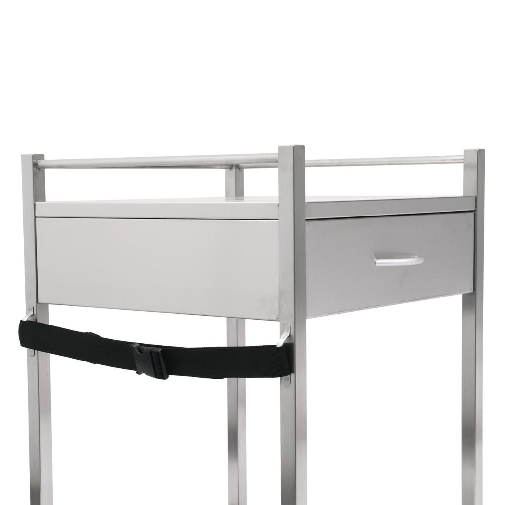 A high grade single drawer stainless steel trolley with extended shelf and strap to support an oxygen bottle up to E in size.