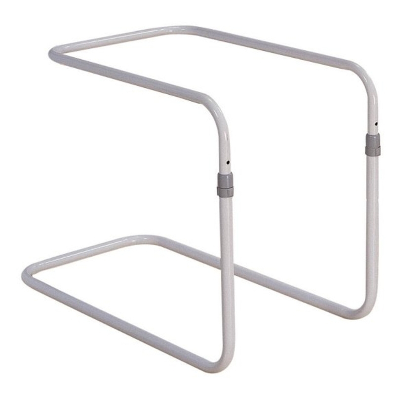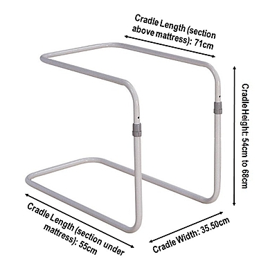 This height adjustable bed cradle is designed to fit under the mattress to form a support to keep the weight of bedding off the feet and legs. The base fits underneath the bed and the upper part is positioned horizontally over the lower part of the body.