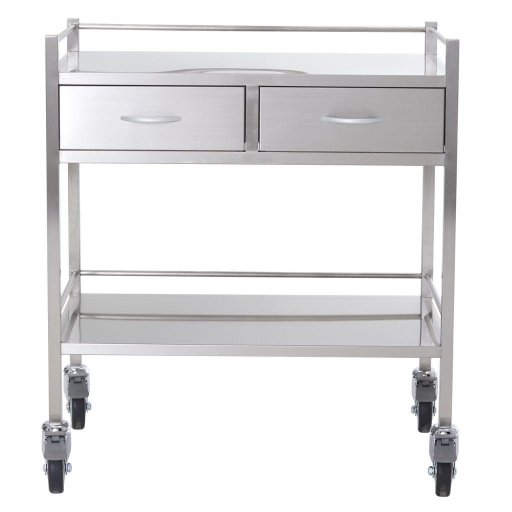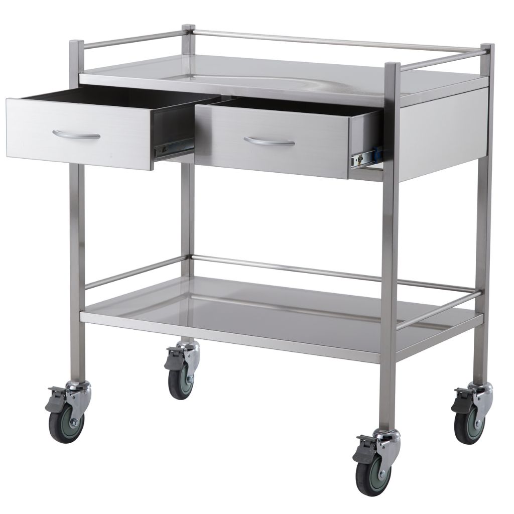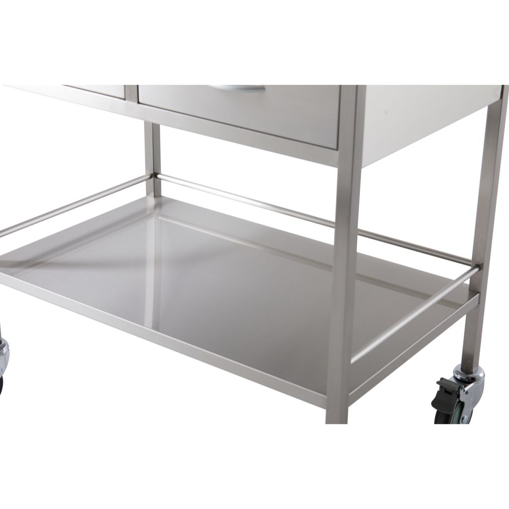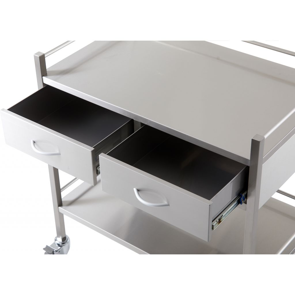 A high grade double two drawer stainless steel trolley. Has top and bottom side rails and lockable castors for safety.